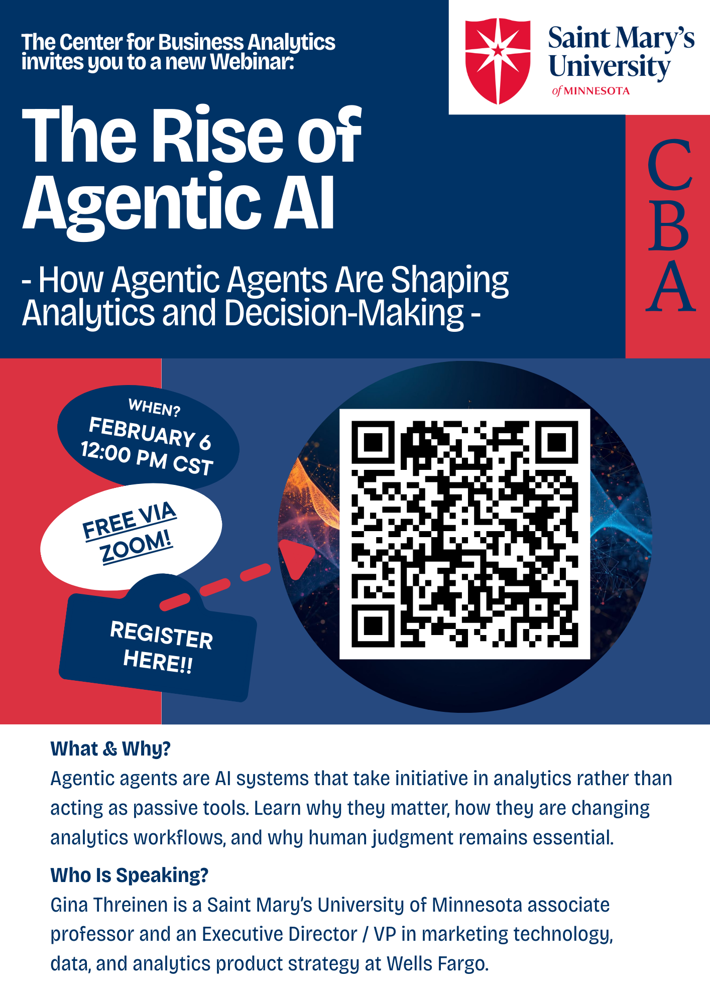 Gina Threinen, SMUMN’s associate professor and Executive Director/VP at Wells Fargo, explores the rise of agentic AI from a conceptual and industry-wide perspective. Drawing on her industry leadership and graduate education experience, Gina examines how agentic agents are influencing modern analytics workflows and how they are redefining the relationship between AI-generated insights and human judgment.